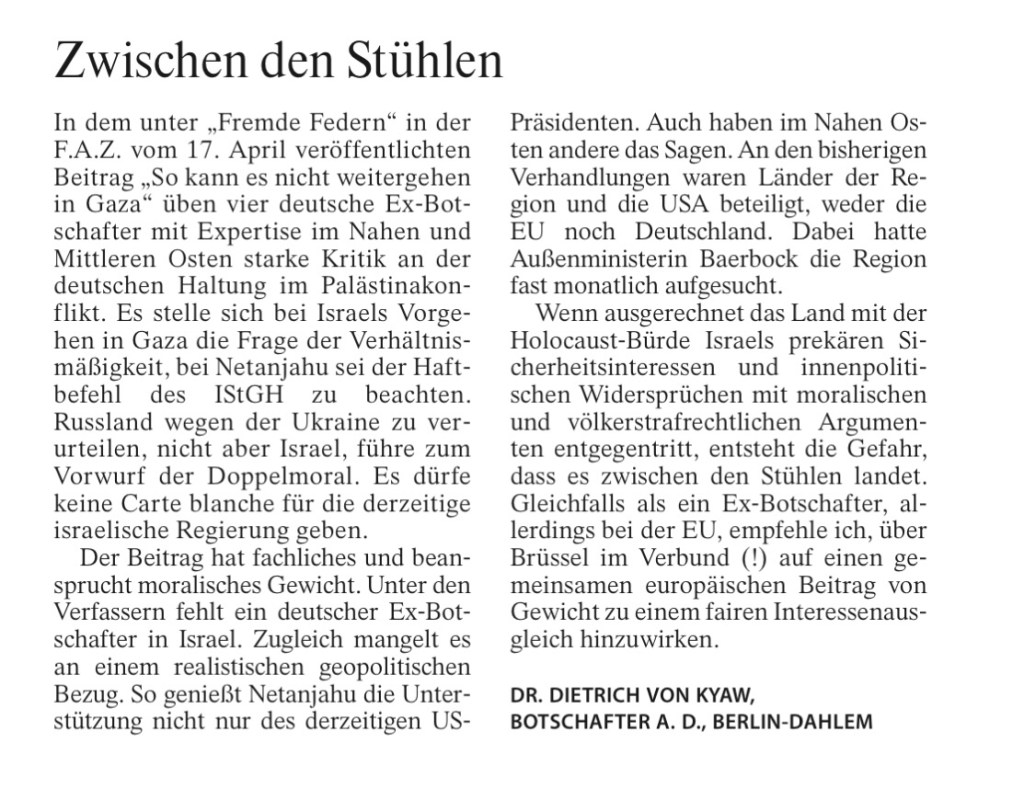 In dem unter „Fremde Federn“ in der F.A.Z. vom 17. April veröffentlichten Beitrag „So kann es nicht weitergehen in Gaza“ üben vier deutsche Ex-Bot-schafter mit Expertise im Nahen und Mittleren Osten starke Kritik an der deutschen Haltung im Palästinakonflikt. Es stelle sich bei Israels Vorgehen in Gaza die Frage der Verhältnismäßigkeit, bei Netanjahu sei der Haftbefehl des IStGH zu beachten. Russland wegen der Ukraine zu verurteilen, nicht aber Israel, führe zum Vorwurf der Doppelmoral. Es dürfe keine Carte blanche für die derzeitige israelische Regierung geben.