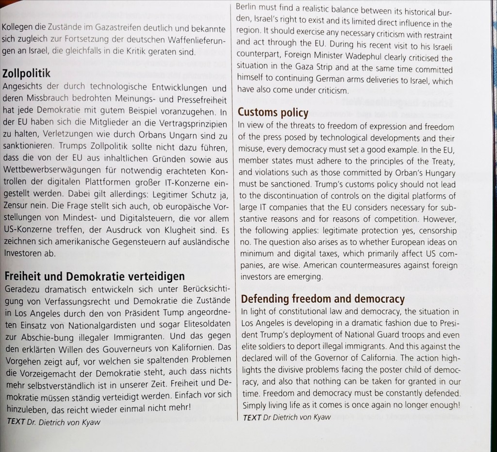 Bei durch technologische Entwicklungen und deren Missbrauch bedrohten Meinungs- und Pressefreiheit hat jede Demokratie mit gutem Beispiel voranzugehen. In der EU haben sich die Mitglieder an die Vertragsprinzipien zu halten, Verletzungen wie durch Orbans Ungarn sind zu sanktionieren. Trumps Zollpolitik sollte nicht dazu führen, dass die von der EU aus inhaltlichen wie Wettbewerbs-gründen für notwendig erachteten Kontrollen der digitalen Plattformen großer IT-Konzerne eingestellt werden. Dabei gilt allerdings: Legitimer Schutz Ja, – Zensur Nein! Die Frage stellt sich auch, ob europäische Vorstellungen von Mindest- und Digitalsteuern, die vor allem US-Konzerne treffen, der Ausdruck von Klugheit sind. Es zeichnen sich amerikanische Gegensteuern auf ausländische Investoren ab. Geradezu dramatisch entwickeln sich unter Berücksichtigung von Verfassungs-recht und Demokratie die Zustände in Los Angeles durch den von Präsident Tump angeordneten Einsatz von Nationalgardisten und sogar Elitesoldaten zur Abschiebung illegaler Immigranten und das gegen den erklärten Willen des Gouverneurs von Kalifornien. Das Vorgehen zeigt auf, vor welchen sie spaltenden Problemen die Vorzeigemacht der Demokratie steht, auch dass nichts mehr selbstverständlich ist in unserer Zeit. Freiheit und Demokratie müssen ständig verteidigt werden. Einfach vor sich hinzuleben, das reicht wieder einmal nicht mehr!